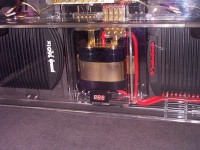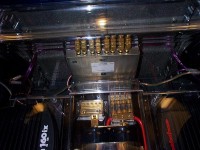 Bei diesem Mercedes wurden die Verstärker, die Pufferungselkos und die DSP Blackbox in einem Rack aus Plexiglas integriert.